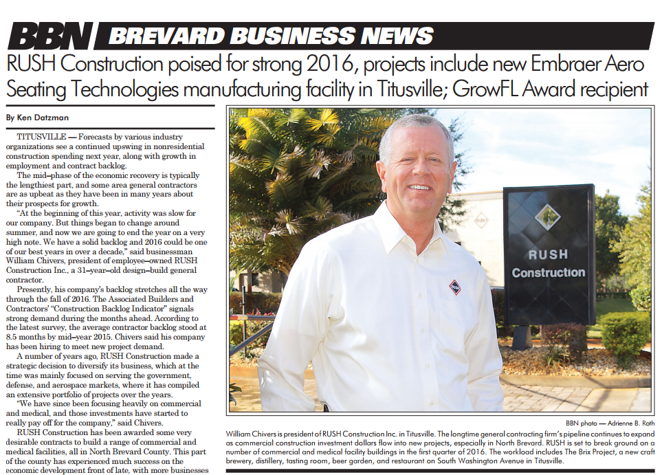 Heavily involved in the construction projects happening all around Florida, RUSH Construction, Inc., President, William Chivers is honored to be highlighted in this month’s i4 Business Magazine, a publication which prides itself in “promoting entrepreneurship throughout Central Florida.” In the article, Chivers speaks of how he got started in the industry, how RUSH has persevered…