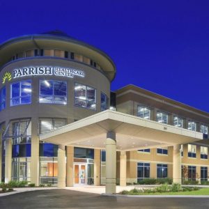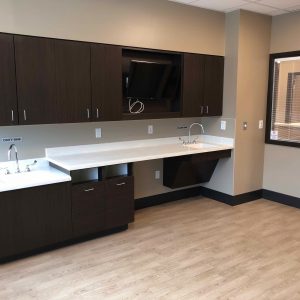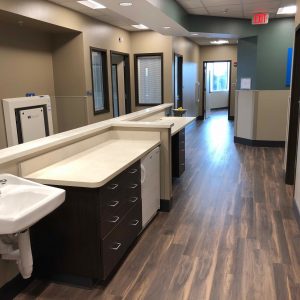 RUSH Construction (RUSH) served as the general contractor for the interior build-out of a portion of the Parrish Healthcare Medical Office Building at Titus Landing (also constructed by RUSH Construction, Inc.). The new facility is a Home Hemodialysis clinic where patients and their healthcare partners typically receive 3 to 5 weeks of training by a Home Dialysis training nurse. This then allows the patients to perform dialysis in the comfort and privacy of their own home. The new clinic has 2 treatment rooms, administrative and business offices, a lounge and a waiting area, with a custom paneling product adds the visually appealing appearance of cypress paneling while using a more readily renewable resource like southern pine and helping to avoid over-harvesting of cypress in wetlands.